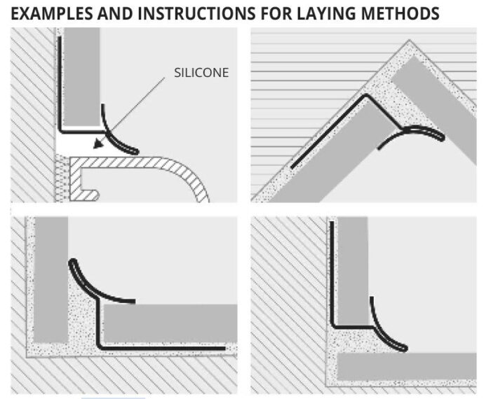 Este un profil de colț interior, conceput special pentru a asigura o îmbinare perfectă și igienică la unghiurile de 90° dintre pereți sau între pereți și pardoseală. Datorită formei sale curbe și a materialului din care este fabricat (INOX AISI304), acest profil este ideal pentru locurile unde igiena este esențială: zone de prelucrare și comercializare a produselor alimentare, spitale, cabinete medicale, toalete și altele. Este un profil durabil, estetic și se montează odată cu ceramica, fiind fixat în adeziv. Când este aplicat la îmbinarea dintre faianță și cadita de duș, se recomandă utilizarea de silicon pentru fixare și etanșare.