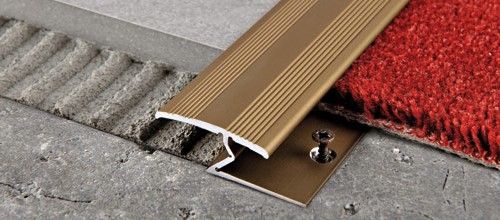 Un profil scăzut de găurit sau adeziv din aluminiu anodizat, pentru tăiere, legare sau îmbinare a covoarelor, PVC, linoleum, țiglă ceramică sau podele din lemn.